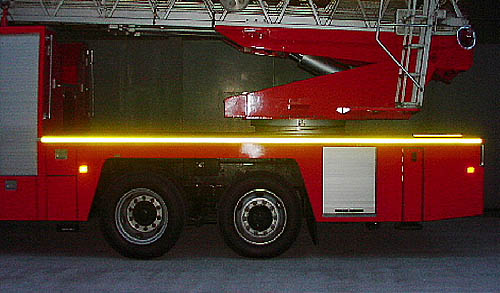 反射テープをボディー周囲に張り巡らすことにより夜間走行時、はしご車の存在を明示でき交通事故防止に役立ちます。