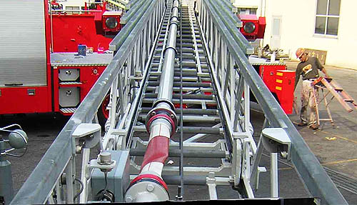 先端(バスケット)放水銃・接続ホースから、1段目梯体最後部まで固定配管取付梯体ホース接続の容易化。